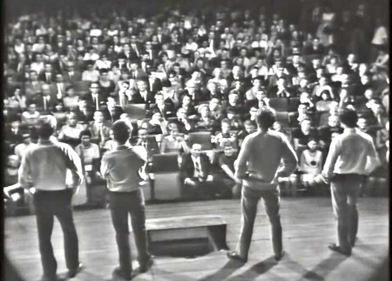 in dem standbild oben sieht man, wenn man will, die rockgruppe kraftwerk anklingen: – auch vier junge, ernste männer, die sich in viererreihe vors publikum stellten und minimalistisches vortrugen.