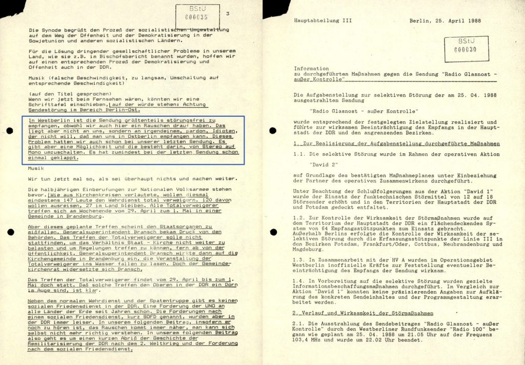 der ans ende kommenden, quasi staatsbankrotten DDR war radio 100 ein dorn im auge. die DDR hat immer behauptet, den rundfunk nicht zu stören. hier ist der beweis. links schreibt die stasi die moderation der sendung „radio glasnost“ ab, rechts schreibt sie vom gelingen der störmaßnahmen. die umrahmung links stammt von mir und ist nicht teil des dokuments.