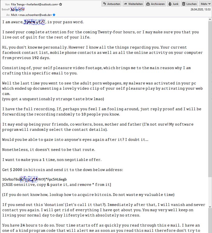 the following screenshot is an email which entered my spam folder today. i have a „sense“ for emails with a bad intent and tend to delete them straight away. but this one caught my attention because in the subject line and in the first line of the email i found a password which i often used in the past. the password was not depicted completely correct, a lower/uppercase variation was missing, but basically it was quite a shock. image you’ve used a password like, say, 666the-Devil, hundreds of times, and then an email arrives which states: i know, 666the-devil [lowercase d] is your password – this would trigger alarm bells.