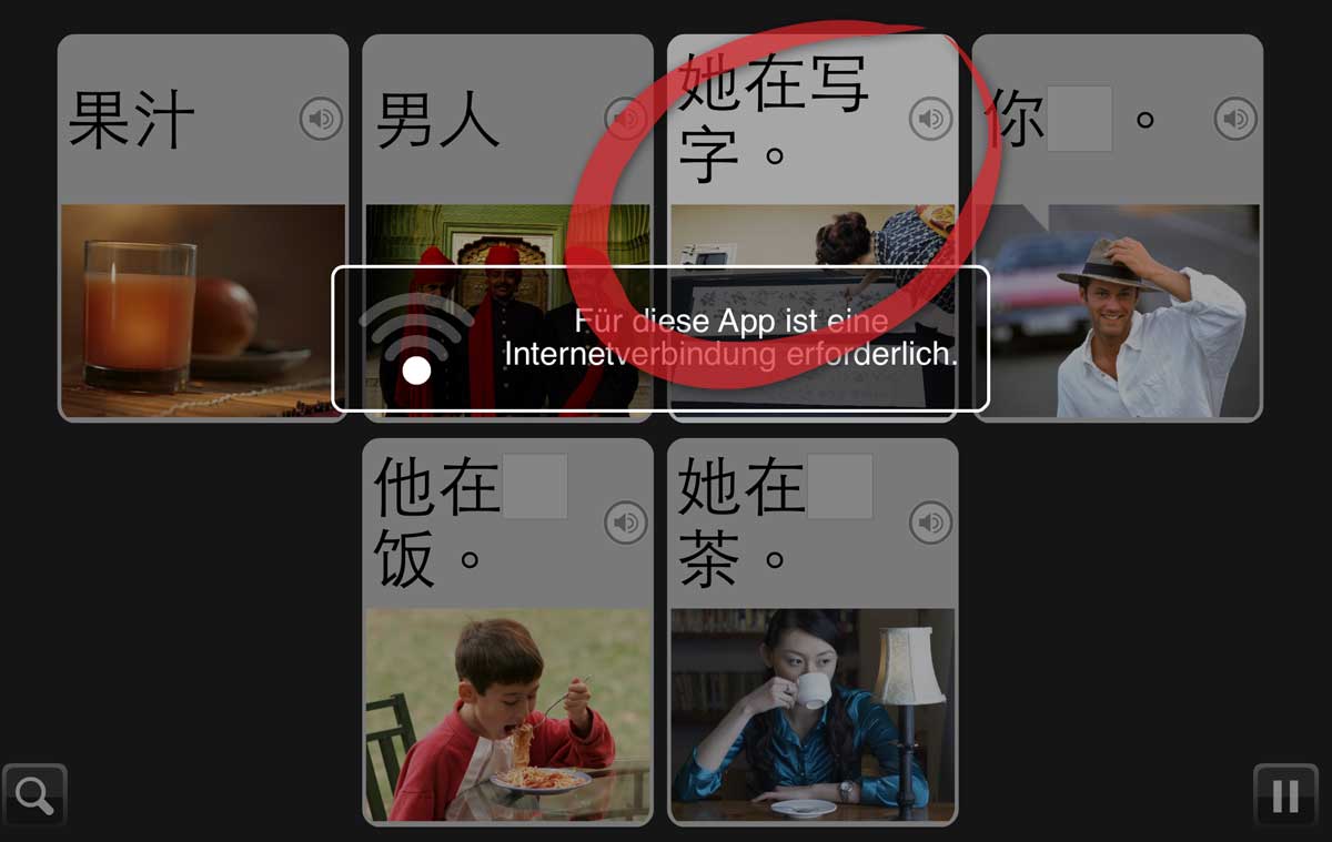 jetzt gibt es rosetta stone in vielen sprachen für android- und apple iOS-geräte. und sage: hut ab, es funktioniert prima auf den geräten. und sage: finger weg, so geht das überhaupt nicht! die app ist teuer, mandarin chinesisch kostet 200 €. aber die krankt an der internetverbindung, die sie fordert. sie krankt auch an noch etwas anderem, nämlich dass man – bei sprachen wie chinesisch, arabisch, griechisch etc. wichtig – ja auch die schrift lernen möchte, und trotz der wunderbaren touchscreens der smartphones und tablets wird dies (also quasi das malen von buchstaben und zeichen auf dem screen) nicht unterstützt. die lektionen zum schreiben kann man also knicken. man kauft ein feature, das nicht geliefert wird, obwohl das gerät selbstverständlich zeicheneingabe beherrscht. großer punktabzug. eigentlich ausreichend für geld_zurück.*