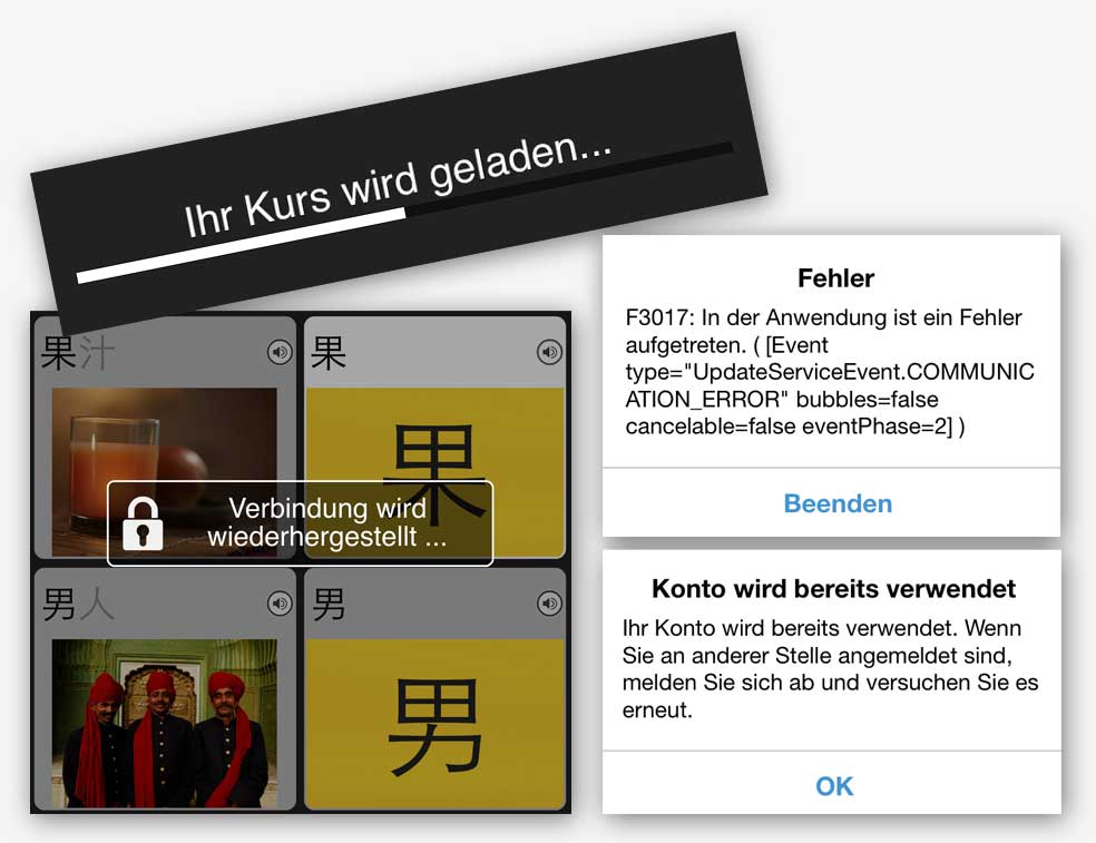manche lernen sprachen zuhause. eine app ist bekanntlich für mobile geräte gemacht, also lernt man zum beispiel im flugzeug: keine chance! denn es ist jederzeit eine internetverbindung nötig. oder im zug? ich war im ICE von köln nach würzburg und konnte eine viertel lektion durcharbeiten – weil der zug natürlich nur brüchige internetverbindungen ermöglicht.
