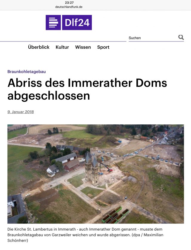 das war gestern. heute, 9. januar 2018, fiel das kirchenschiff in den morgenstunden. als wir, raimond und superbass von wikipedia/wikicommons, ankamen, standen nur noch die beiden türme. die szenerie war nach den protesten gestern ruhig. viel polizei, viel presse und einige umweltaktivisten, aber ohne größere aktionen. baustellenleitung und polizei baten mich drohnenfotografen außerordentlich freundlich, nicht direkt über das gelände zu fliegen. in dem foto unten sieht man eine von zwei, stellenweise sogar drei drohnen im himmel, aufgenommen von meiner drohne.