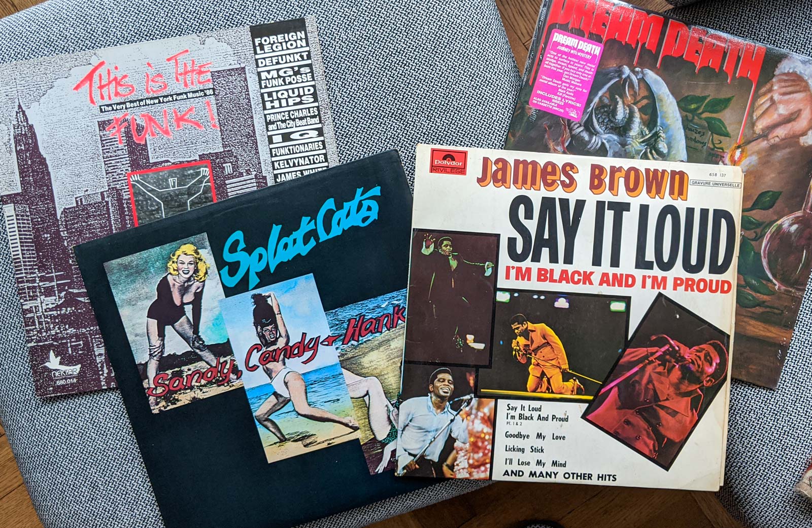 this is the funk! is an early „new funk“ compilation from the mid 1980s, new york city. james white (aka james chance) stands out. the splat cats maxi single sounds like the ramones. dream death is thrash/death metal, mainly about, yes, death. and, two decades earlier, a second hand new york greenwich village purchase, one of my LP jewels: james brown, say it loud. acoustically horrible, but great cover. brown wrote the song in the aftermath of the killing of martin luther king in april 1968.