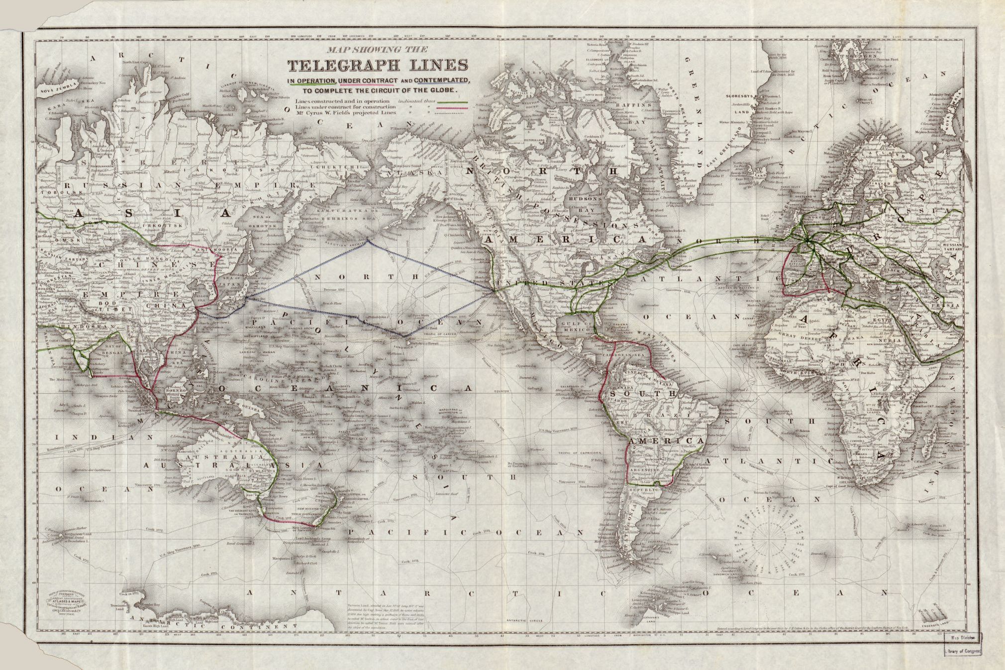 of course, this was long before the telephone. telegraph lines operated with morse code transmissions. the european centre at that time was london. africa and south america more or less out of touch. there’s a blue (blue means vaguely planned) parallelogram in the north pacific which seems to be the only contemplated redundancy/backup connection. the path starts at san francisco and continues to japan and, with a single line, to shanghai.