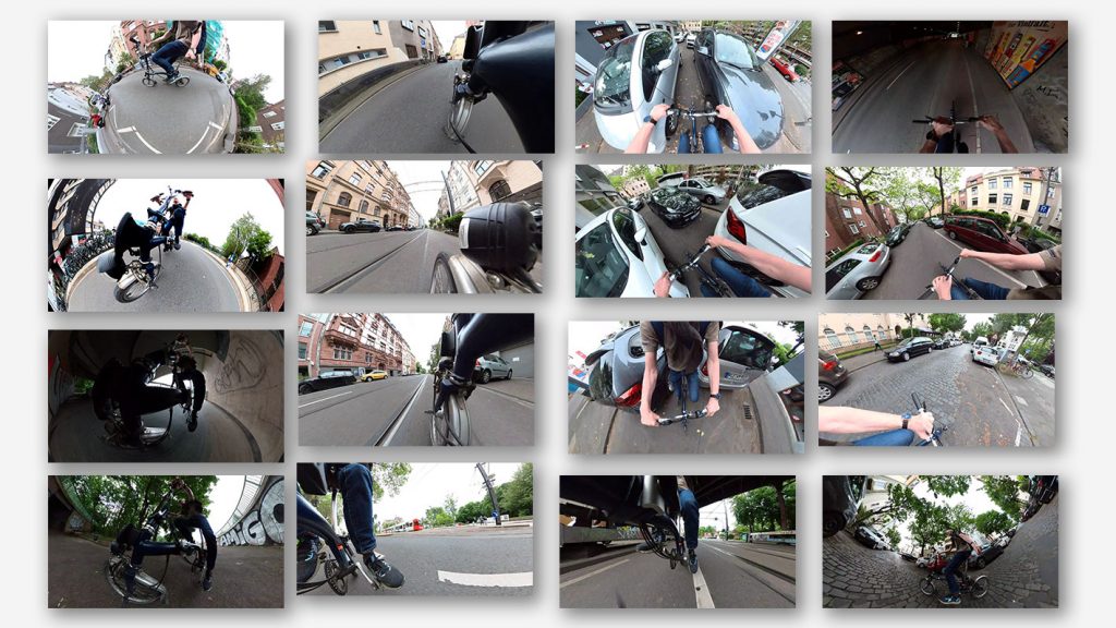 360° mini cameras for 500 € provide us with endless options. in the example above i shot a time lapse video on my way home, on the brompton bike. the video is totally uninteresting, but exploiting 16 of the 50 or so shots and viewing different angles led to this sweet image collage.