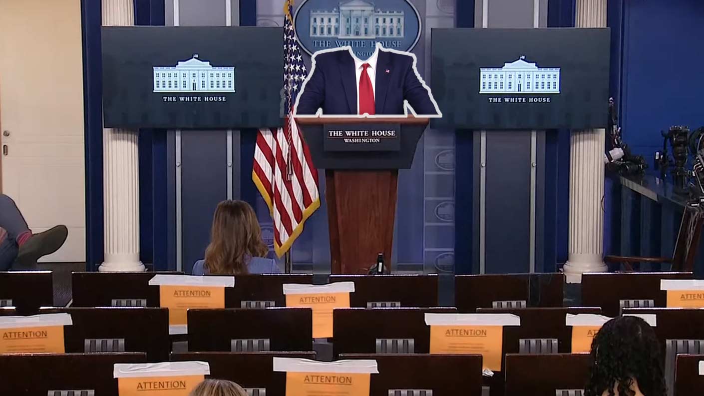 gestern (6. april) war er noch staatsmännischer als zuvor. wegen der dünnen inhalte seiner fast einstündigen abgelesenen rede stachen die „great people doing great jobs“-vokabeln doppelt heraus. vor allem aber setzte er bei den reporterfragen einen schon länger schweledenden, jetzt aber ganz deutlichen ton: er forderte die reporter auf, angesichts der „great things“, die in diesen „hard times“ passieren, fragen zu stellen, die das unterstützen – statt kritische einwände vorzubringen.