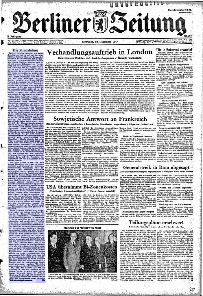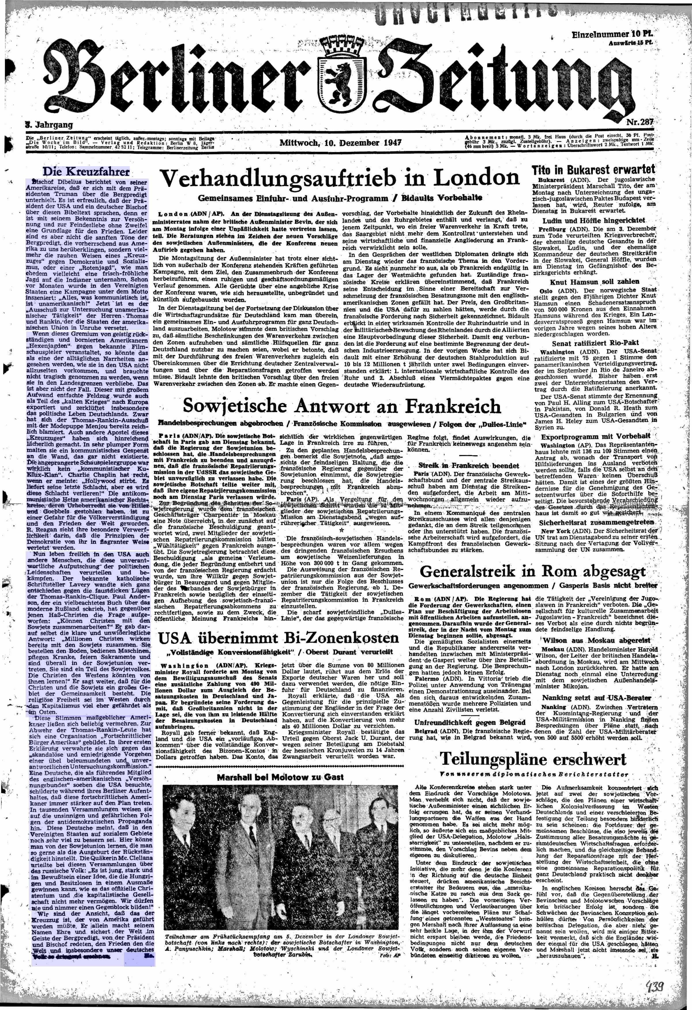 der artikel ist auch insofern interessant, als er den ton in der politik der zeit gut wiedergibt. „geistig rückständig und bornierte amerikaner…“ borniert waren die kommunistenverfolger des späteren mcCarthy, aber geistig rückständig? diese derben ausdrucksweisen waren nicht typisch für die zeitungen der sowjetischen besatzungszone (wie hier), sondern tauchten gleichermaßen in der west-presse auf.