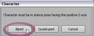 Wieder erscheint ein Dialog mit dem feinen Angebot, die Figur Motionbuildergerecht aufzubereiten, sie zum "Character" zu machen. Bestätigen Sie "characterize". Es folgt die Frage, ob die Figur als Zweibeiner oder Vierbeiner angelegt werden soll. Wählen Sie "Biped". |