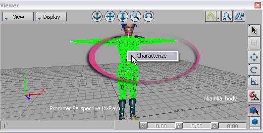 Look at the menu bar of the Viewer window and from "Display" choose "X-Ray". This lets you see what's inside Mia. |