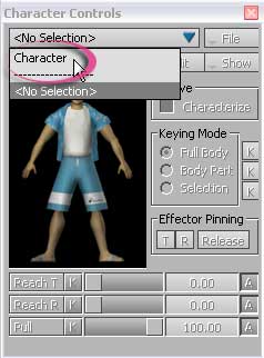 Wenn Sie jetzt wieder rüber ins Character Controls-Fensterchen blicken, werden Sie unter dem Pulldown-Menü "No Selection" den "Character" finden. Wählen Sie ihn aus. Wenn Sie Lust haben, ein wenig zu suchen, benennen Sie ihn in "Mia" um. |