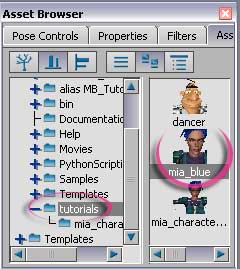 Wir laden zunächste eine Figur in die Szene, sprich in den "Viewer" , die noch nicht "charaterized" und erst recht nicht "geriggt" wurde. Öffenen Sie dazu wie im ersten Tutorial im Asset Browser die "tutorials". Wenn Sie sich damit nicht zurecht finden, blättern Sie bitte zurück. Unter den Tutorial-Dateien finden Sie eine, die einfach "mia_blue" heißt.. |
