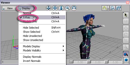Im Viewer finden Sie oben ein Pulldown-Menü namens "Display" (Ansicht), über das Sie die Röntgenansicht einschalten können: "X-Ray". Damit sehen Sie, was in Mia drinsteckt. |