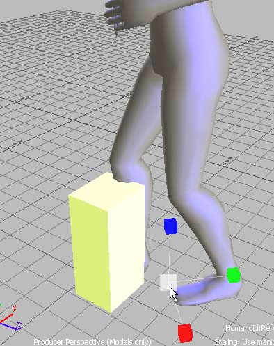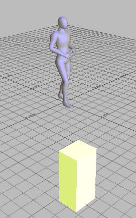 First, load a characterized and rigged character into the scene. I use the "humanoid" from the installation CD as in previous cases. Our goal is to make the character stand in front of the yellow cube, with his right foot planted on the top of the cube and the dimensions adjusted properly. |